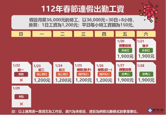 雇主屆時如有需要勞工於春節連假期間加班,以月薪為新臺幣36,000元的勞工(以36,000元÷30日÷8小時,推算平日每小時工資額為150元),出勤8小時為例,其各日出勤及工資給付規定如下: