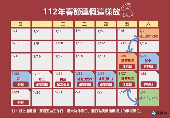 勞動部強調,112年春節連假期間之出勤及工資給付,事業單位應依法辦理。雇主如有違反相關規定,勞工可檢具相關事證,就近向當地勞工行政主管機關【直轄市、縣(市)政府勞工局(處)或社會局(處)】申訴,以維權益。